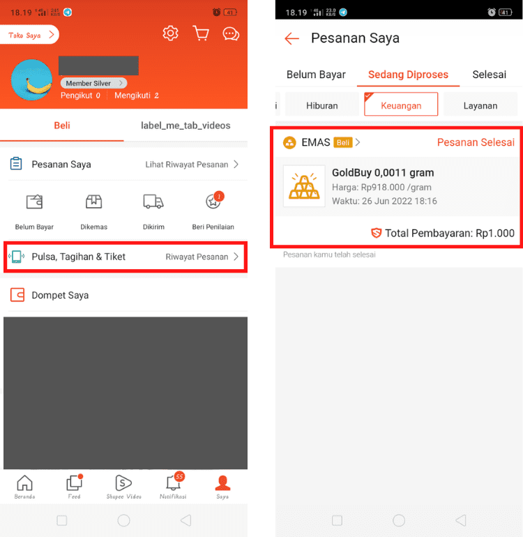 6. Untuk bisa melihat riwayat pembelian emas, kamu bisa tekan menu Saya dan kemudian pilih menu Pulsa, Tagihan & Tiket. Kemudian aplikasi Shopee akan menampilkan riwayat pembelian emas kamu.