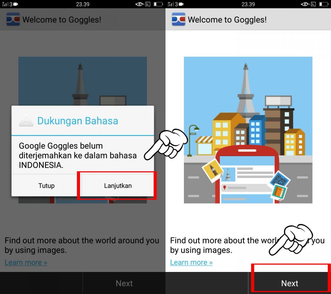 2. Setelah terinstall, jalankan aplikasi Google Goggles, pada tampilan awal kamu akan melihat permission dukungan bahasa dan sedikit pengenalan yang berisi informasi tentang pencarian dengan gambar. Pilih Lanjutkan lalu Next.