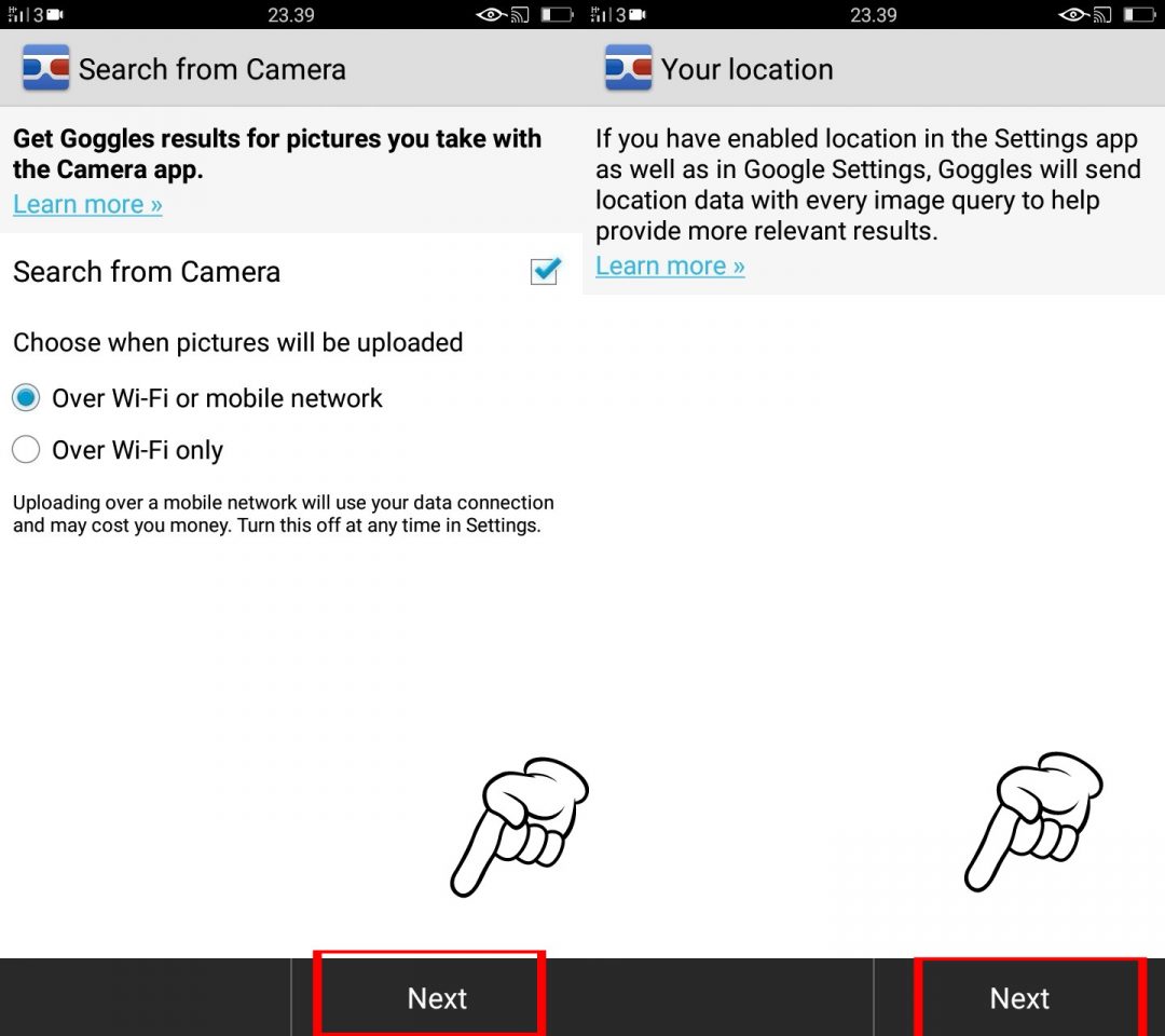 3. Selanjutnya kamu diminta memilih permission jaringan yang akan di gunakan untuk pencarian gambar. Pilih Over Wi-fi or mobile network yang mengartikan jaring pencarian yang akan di gunakan adalah Wi-fi jika tersedia, atau data standar. Next untuk melanjutkan.