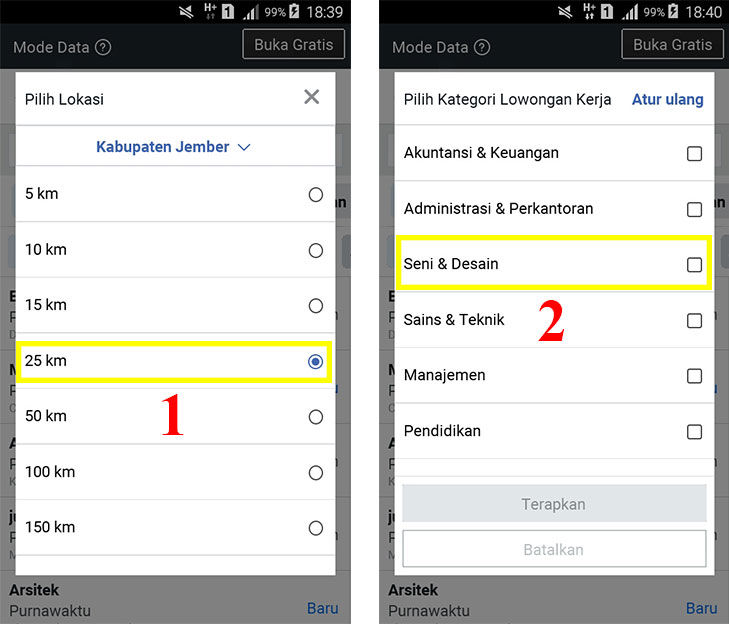 4. Untuk menemukan wilayah dan jenis pekerjaan yang lebih spesifik, kamu bisa mengubah pengaturan lokasi dan jenis lowongan pekerjaan sesuai kemampuan yang kamu kuasai. Jika kamu menekuni dunia desain, kamu bisa memilih opsi Seni dan Desain.