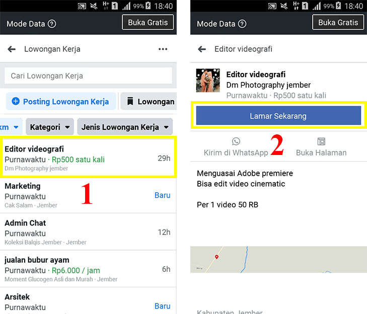 Salah satu media sosial yang masih banyak digunakan khususnya di indonesia adalah Facebook. Facebook menyediakan banyak fitur yang mendukung seseorang untuk membagikan informasi pada banyak orang. Salah satu fitur yang mulai berkembang di Facebook adalah fitur Lowongan Pekerjaan. Fitur ini, membuat pengguna aplikasi Facebook menjadi lebih mudah untuk menemukan lowongan pekerjaan melalui media sosial. Pada artikel kali ini, penulis akan membahas cara mudah mencari lowongan pekerjaan via Facebook Lite.
