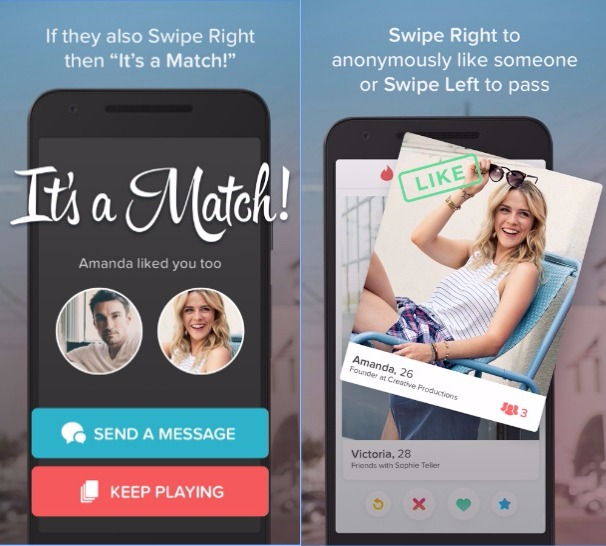 Tinder merupakan aplikasi yang dikhususkan untuk mencari pasangan, aplikasi tinder ini mempunyai fitur people nearby yang dapat mencari atau menemukan pengguna dengan jarak yang paling dekat, untuk penggunaan aplikasi ini kamu cukup geser ke kekanan bila kamu suka dan jika tidak suka geser ke kiri. Tunggu konfrimasi dari dia, jika dia aktif dan tertarik maka akan mengkonfrimasi pertemanan kamu. Kamu juga bisa menyortir yang ingin ditampilkan wanita atau pria.