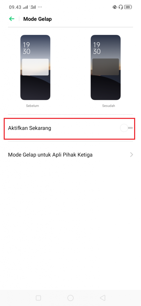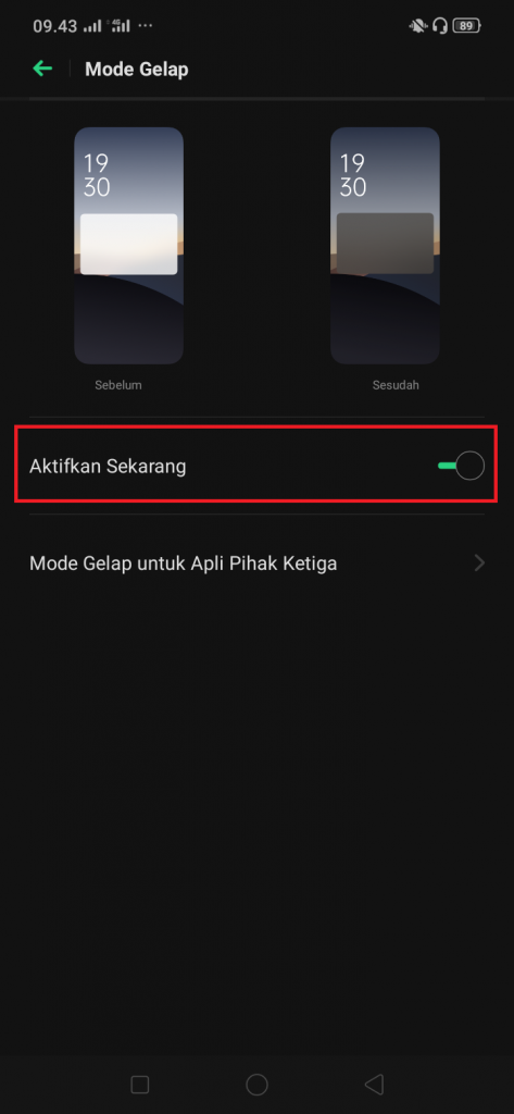 5. Tekan turn on Aktifkan Sekarang agar dark mode bisa diaktifkan secara menyeluruh. Kamu bisa melihat tampilan sampel yang tertera di bawah ini.