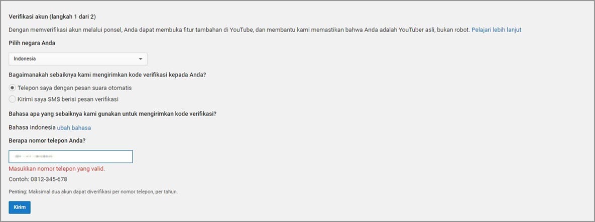 6. Masukkan nomor telepon kamu – kirim. Ikuti proses verifikasi yang diminta oleh Google hingga selesai.