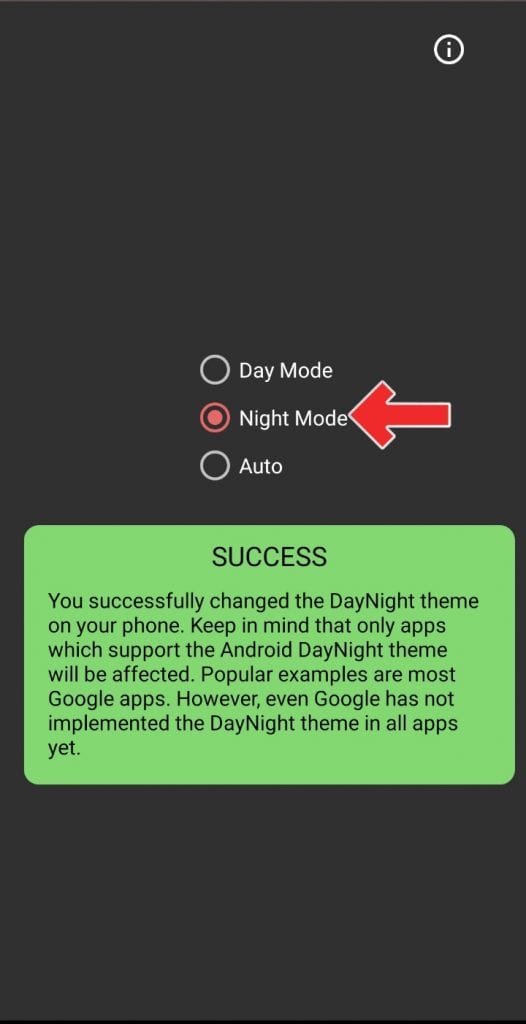 3. Setelah aplikasi “Dark Mode” terinstal di Android kamu, buka aplikasi tersebut. Nah, begini tampilan dari aplikasi Dark Mode, cukup sederhana. Nah, disini ada 3 opsi yaitu Day Mode, Night Mode dan Auto. Kamu bisa memilih Night Mode.