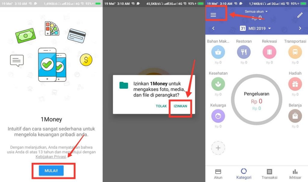 2. Buka dan klik tombol Mulai lalu Izinkan. Untuk mengamankan data, kamu klik tombol strip tiga di pojok kiri atas .