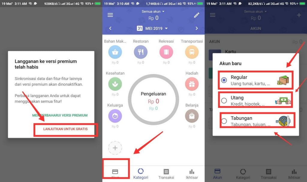 4. Karena aplikasi ini termasuk aplikasi pengatur keuangan terbaik, aplikasi ini memberikan dua pilihan antara premium yang menyediakan fitur lebih lengkap atau gratis. Kamu bisa memilihnya sesuai keinginan. Dan untuk memasukan saldo sebagai awal permulaan keuangan untuk di hitung, kamu bisa klik tombol Akun di pojok kiri bawah, lalu memilih satu diantara tiga. Yaitu : Regular, Utang, dan Tabungan.