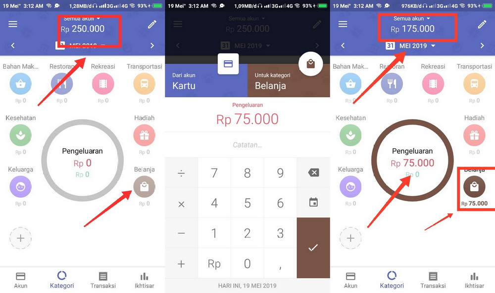 6. Untuk cara penggunaanya, kamu bisa mulai dengan memilih salah satu objek menu yang tersedia sesuai dengan objek pengeluaran. Semisal kamu berbelanja. Maka klik menu icon belanja dan masukan nominal jumlah pengeluaran yang digunakan untuk berbelanja. Maka nomial uang yang ada akan otomatis berkurang namun anda masih bisa melihat rincian pengeluarannya.