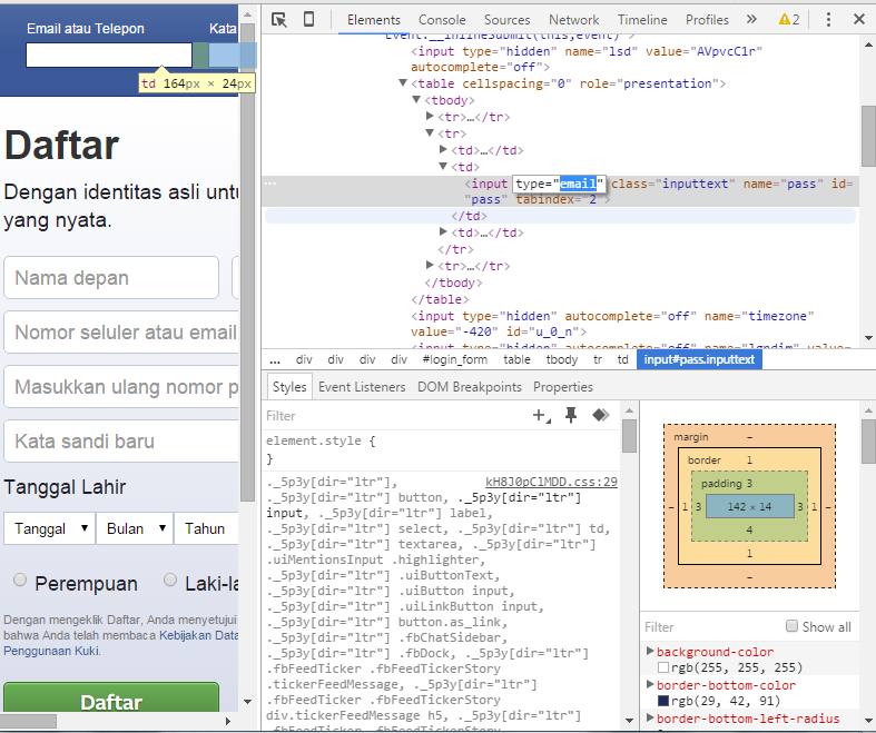 3. Lakukan juga pada kotak pengisian password, dengan mengganti input type “password” menjadi “email” seperti pada gambar.