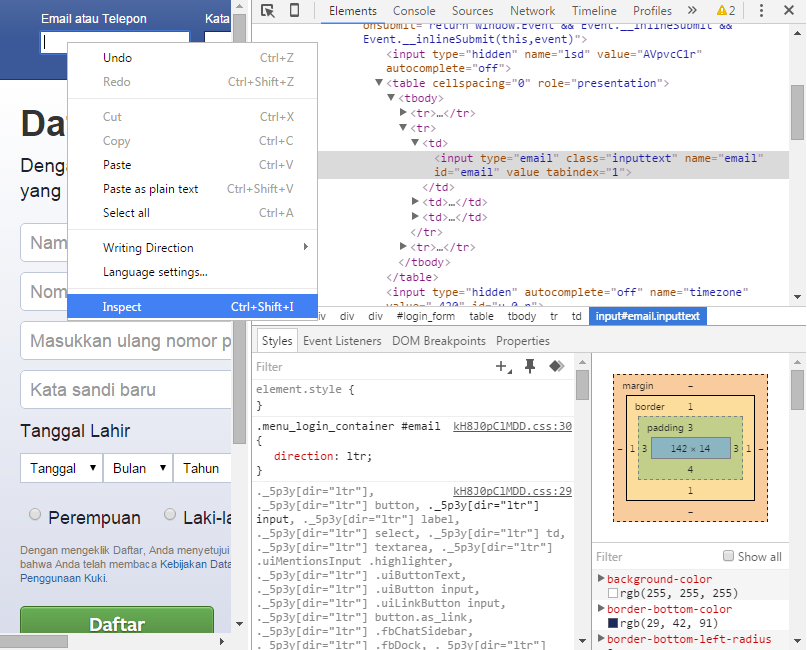 1. Untuk menampilkan fitur inspect bisa menggunakan browser Google Chrome atau Mozilla Firefox. Klik kanan pada kotak tempat pengetikan email, pilih inspect/inspect element, lalu akan muncul tampilan inspect/inspect element,
