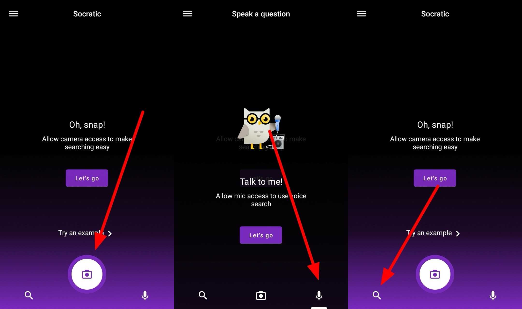 3. Setelah masuk, kamu akan melihat beberapa opsi pilihan yang bisa kamu gunakan untuk menyelesaikan soal ujian. Icon Camera berfungsi untuk mengajukan pertanyaan dalam bentuk snap atau gambar yang kamu ambil. Icon Mic berfungsi untuk mengajukan pertanyaan dalam bentuk perintah suara. Dan Icon Luv atau kaca pembesar berfungsi untuk mengajukan pertanyaan dalam bentuk kalimat yang kamu ketik. Dan pastikan kamu memilih pilihan Izinkan saat pertama kali menggunakan fitur-fitur tersebut.