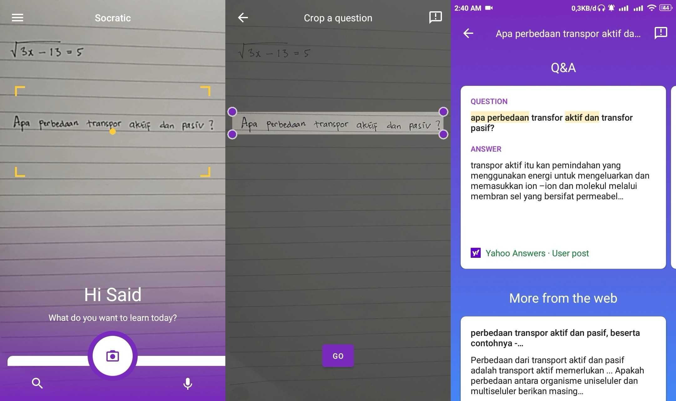4. Untuk penggunaan fitur snap, yang pertama kamu pilih tombol icon camera. Arahkan kamera pada sebuah lembar soal ujian yang sedang kamu kerjakan. Drag atau seret soal yang kamu bidik. Setelah itu ketuk tombol Go. Tunggu beberapa saat hingga jawaban muncul. Atau apabila penggunaan soal matematika, kamu akan di beri beberapa pilihan sumber jawaban beserta jalan cara penyelesaiannya.