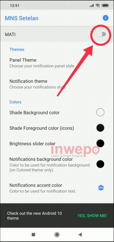 1. Langkah pertama, pastikan kamu sudah mengunduh aplikasi Material Notification Shade. Berikutnya buka aplikasinya dan aktifkan aplikasi dengan cara tap tombol yang berada di bagian pojok kanan atas.