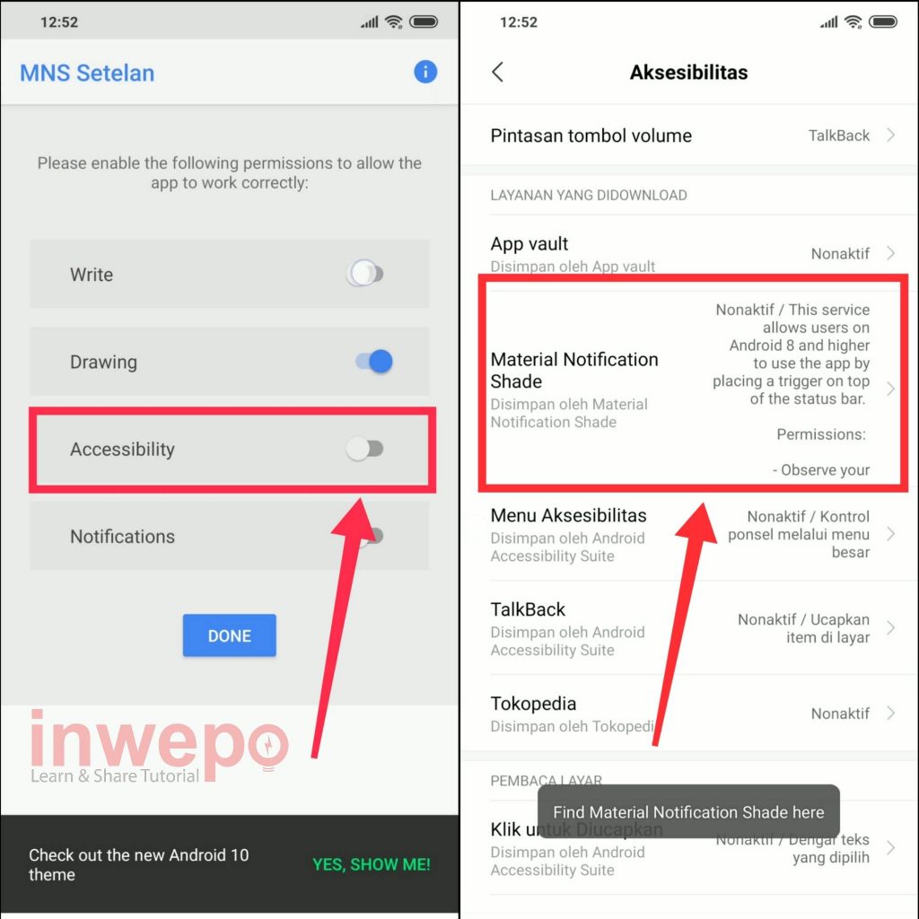 4. Langkah keempat, tap menu Accessibility lalu aktifkan aksebilitas dari Material Notification Shade.