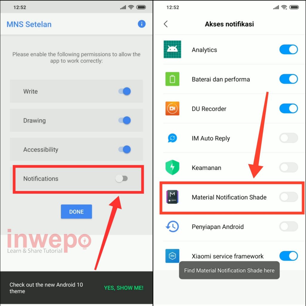 5. Langkah kelima, tap menu Notification lalu aktifkan akses notifikasi pada Material Notification Shade.
