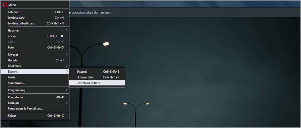 2. Klik logo Opera yang terletak di pojok kiri atas – ekstensi – download ekstensi.