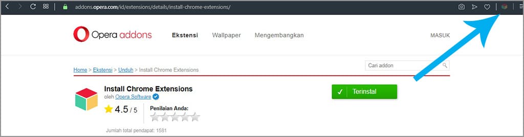 4. Klik tambahkan ke Opera, kemudian tunggu beberapa detik untuk proses pemasangan. Apabila pemasangan berhasil, ikon Install Chrome Extensions akan terletak di pojok kanan atas.