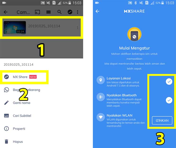 3. Pilih simbol pengaturan (Titik Tiga) yang ada di sebelah kanan video dan pilih MX Share untuk mengirim video.