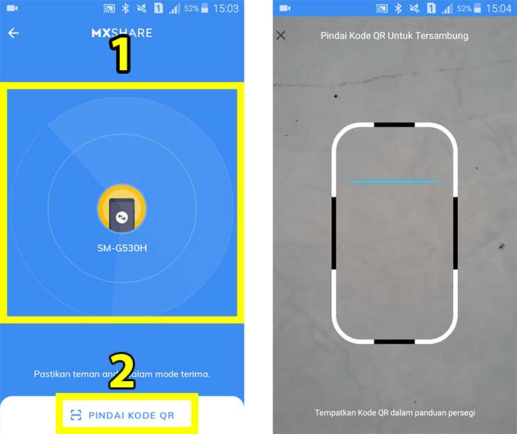 5. Tunggu hingga ponsel mendeteksi perangkat lain dan pilih ikon perangkat yang muncul. Kita juga bisa menggunakan Scan kode QR. Jika berhasil melakukan scanning, file video akan langsung ditransfer ke ponsel penerima.
