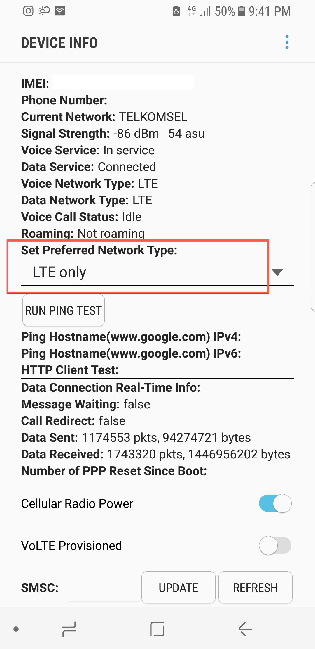 3. Ubah “Set Preferred Network Type:” menjadi 4G Only.