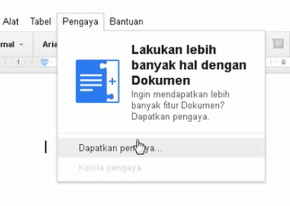 2. Jika sudah login dan sudah mengakses Google Docs, silahkan kalian tekan tab atau tombol pengaya yang ada di atas lalu klik dapatkan pengaya.
