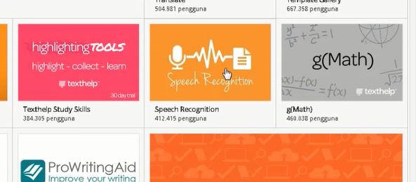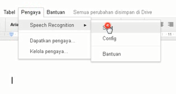 5. Jika aplikasi sudah terinstall silahkan kalian kembali pada dokumen kalian dan Klik tombol pengaya atau tab pengaya yang ada di atas lalu Klik tombol atau pilihan speech recognition dan klik start.