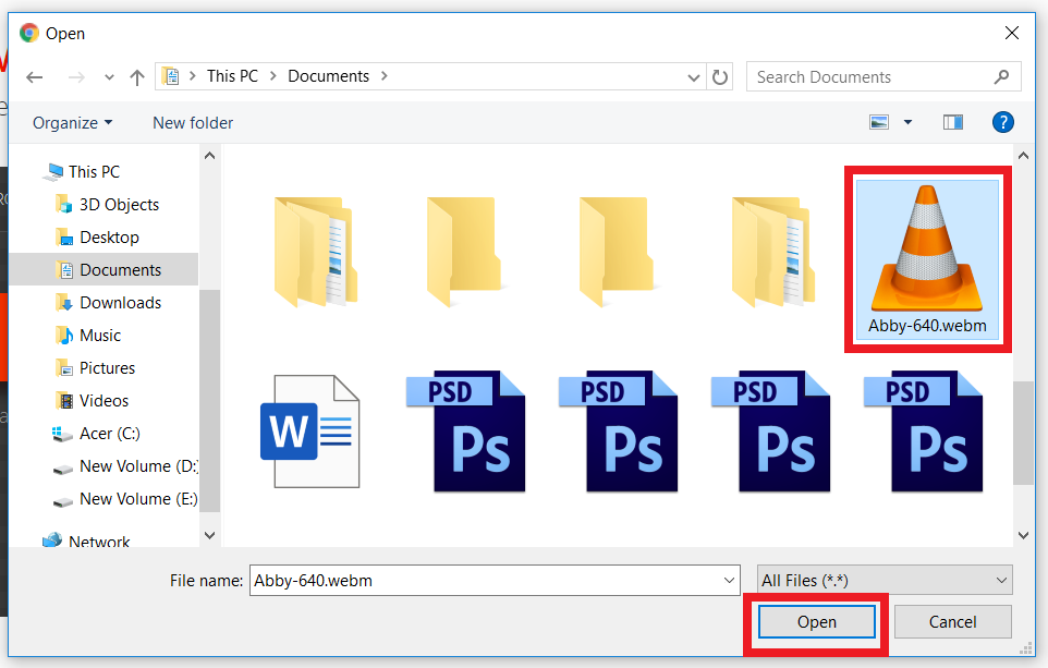 4. Kamu pilih video berformat webm pada komputer kamu dan klik tombol open.