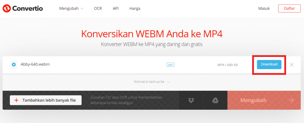 7. Jika sudah maka akan muncul tombol download di samping nama file webm kamu, dan kamu klik tombol tersebut untuk mengunduh file video format terbaru milik kamu.