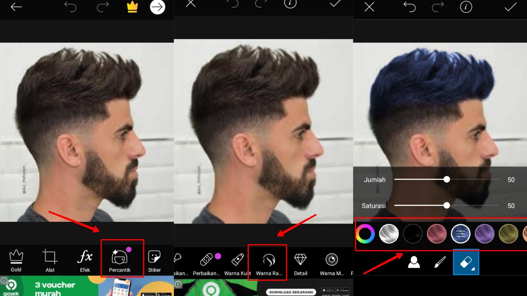 2. Langkah selanjutnya pilih tools atau alat Percantik – Warna Rambut – lalu pilih warna yang akan di terapkan pada rambut di foto kamu. Disini penulis akan menggunakan warna biru sebagai contoh.
