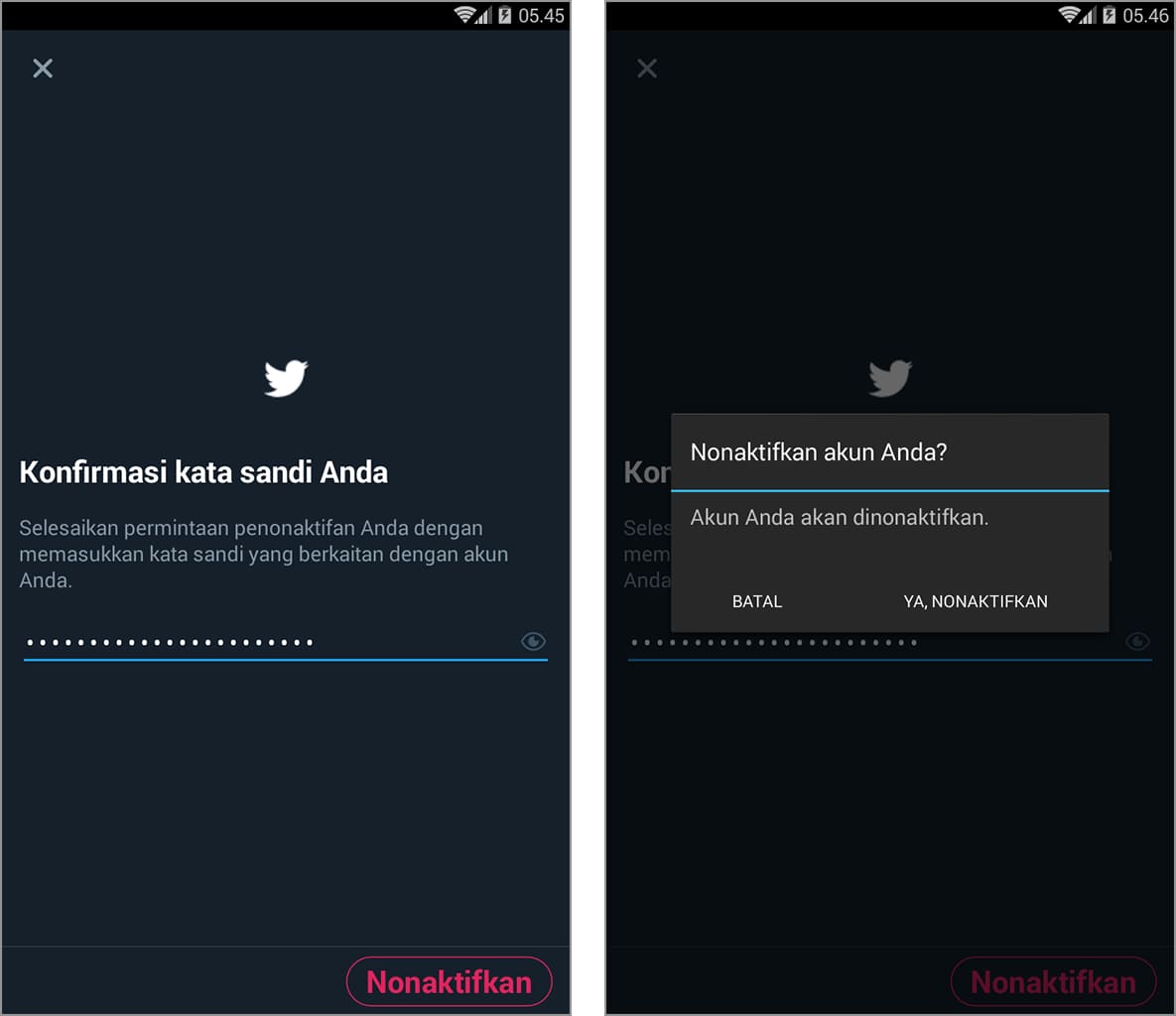 6. Masukkan kata sandi Twitter kamu, kemudian ketuk nonaktifkan – ya, nonaktifkan.