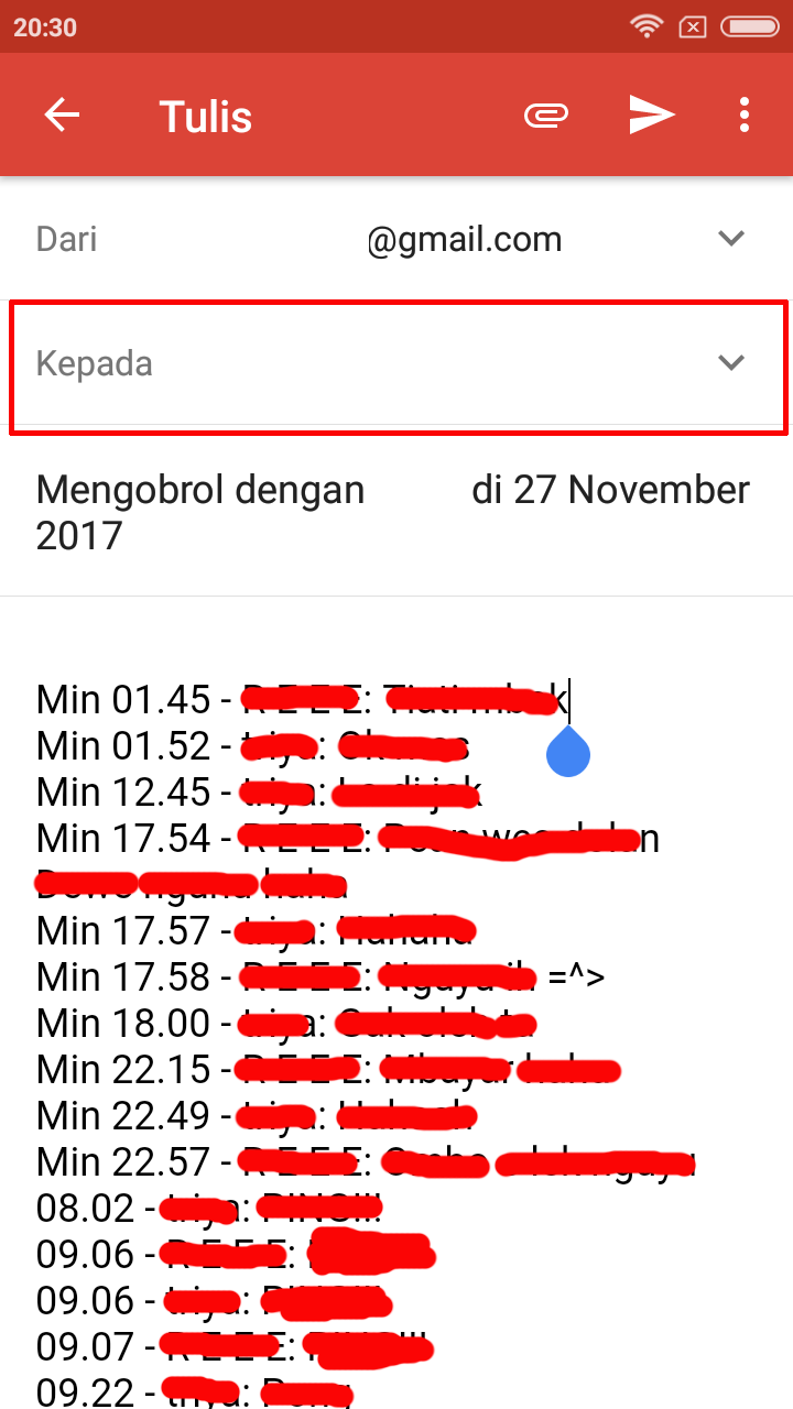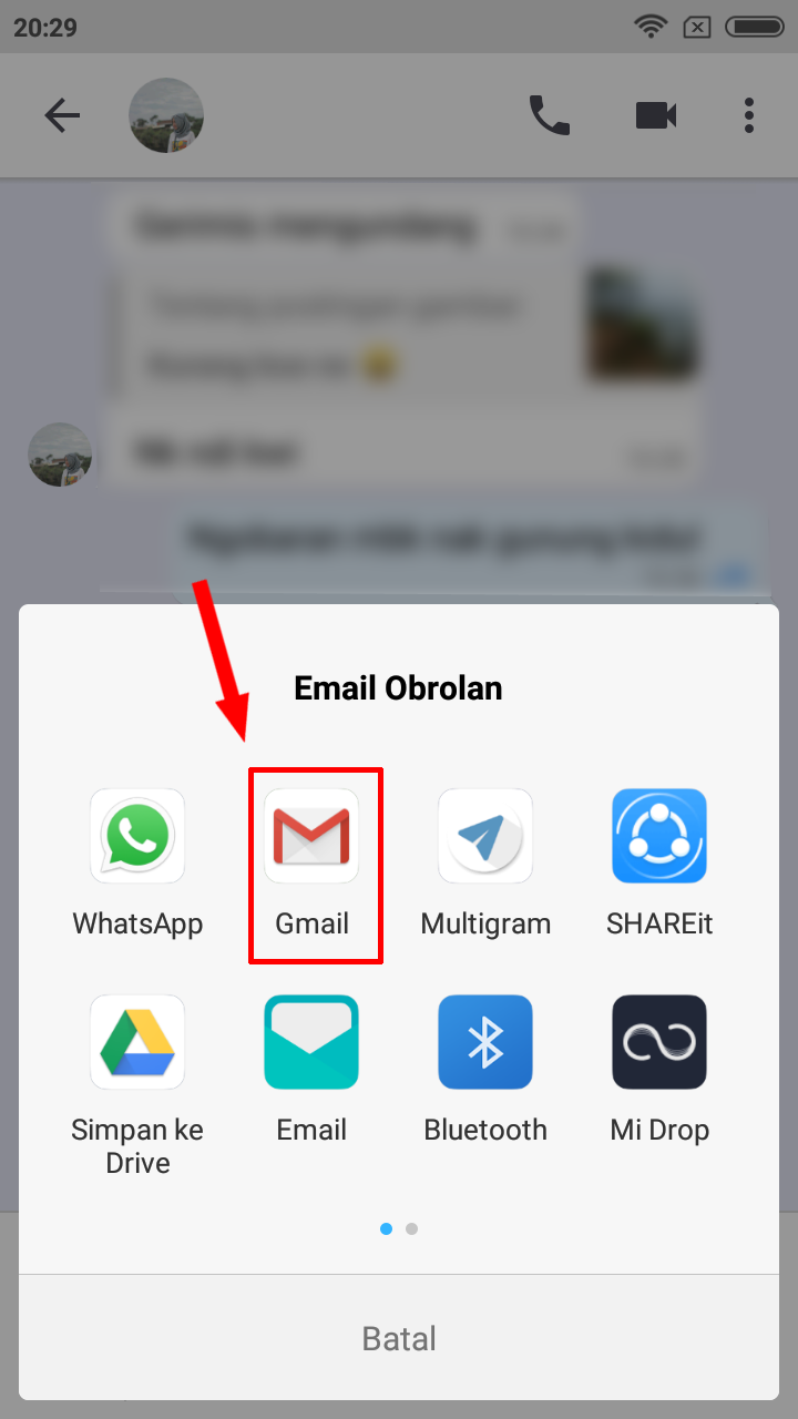 3. Selanjutnya kamu tinggal menambahkan alamat email untuk tempat menyimpan Obrolan chat kamu kemudian tap kirim pada gambar seperti pesawat kertas. Selesai