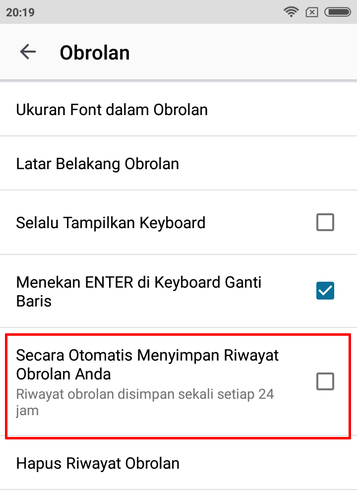 2. Setelah masuk ke menu Obrolan , beri centang pada bagian “Secara Otomatis Menyimpan Riwayat Obrolan Anda” nanti akan keluar notif tap lanjutkan .