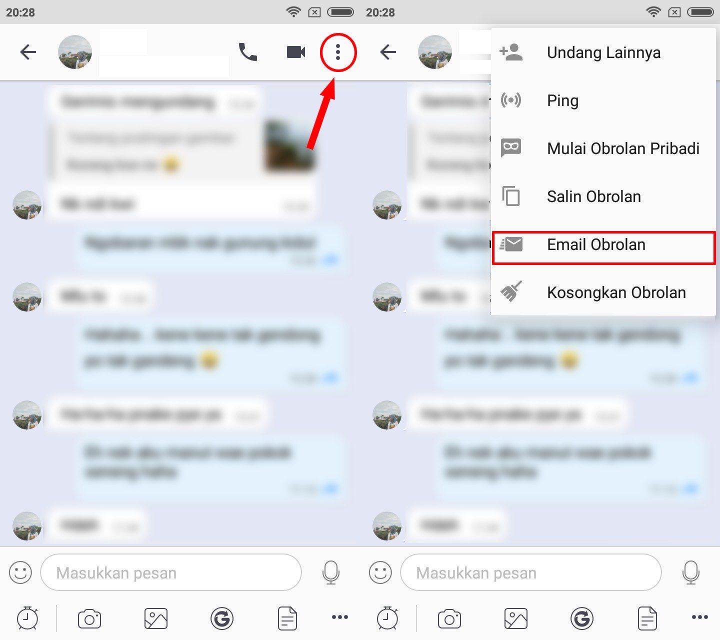 1. Masuk ke salah satu Obrolan chat kemudian tap 3 titik hitam yang berada di pojok kanan atas lalu pilih lagi Email Obrolan.