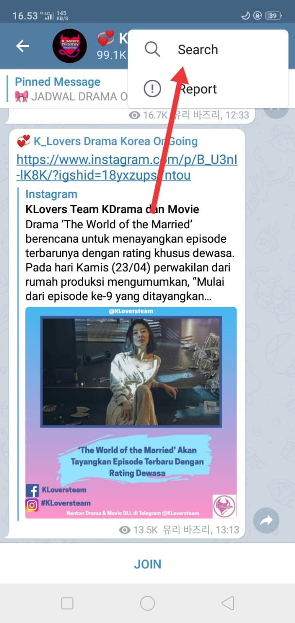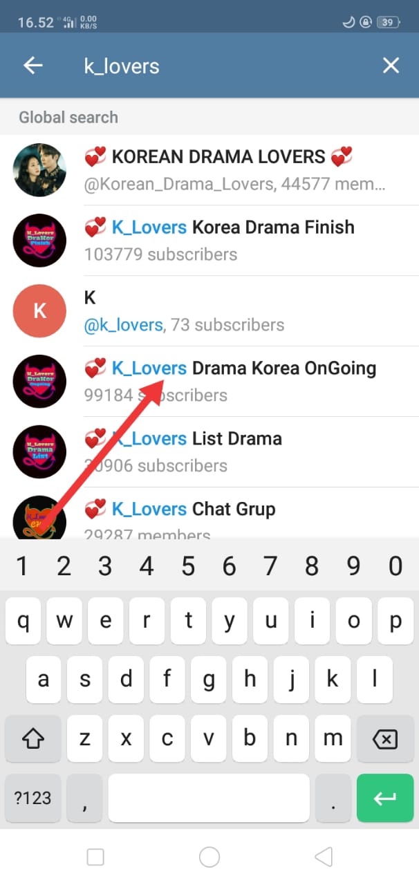 3. Lalu, pada menu utama Telegram, tekan icon search di pojok kanan atas, lalu ketik K_lovers, dan pilih K_Lovers Korea Drama Finish atau K_Lovers Drama Korea OnGoing.