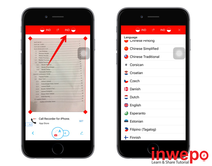 3. Setelah sukses memindai atau Scan – ganti bahasa yang ingin di terjemahkan – Pilih bahasa yang diinginkan.
