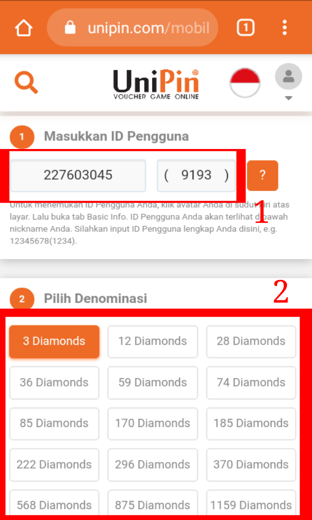 6. Selanjutnya masukan ID Mobile Legends kamu – Pilih jumlah Diamond yang ingin di beli.