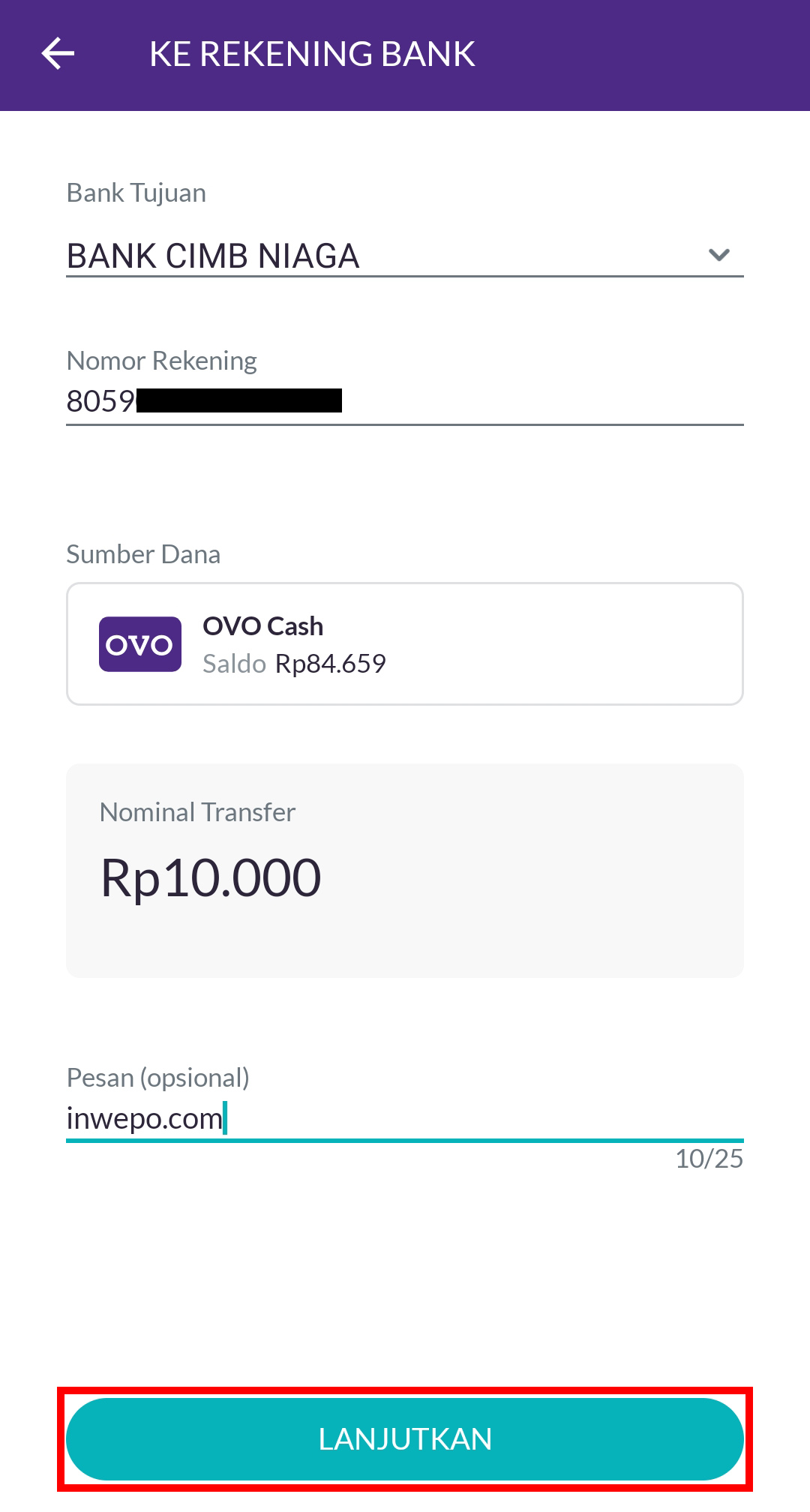 4. Pada Bank Tujuan pilih Bank CIMB Niaga. Untuk Nomor Rekening masukkan angka 8059 diikuti dengan nomor hp yang terdaftar di DANA kamu, misalnya 8059089898989898. Selanjutnya masukkan Nominal Transfer yang kamu inginkan dengan minimal transfer 10.000 rupiah dan akan dikenakan biaya transfer sebesar 2.500 rupiah. Kamu juga bisa menambahkan catatan bila diperlukan. Jika data sudah benar, klik Lanjutkan.