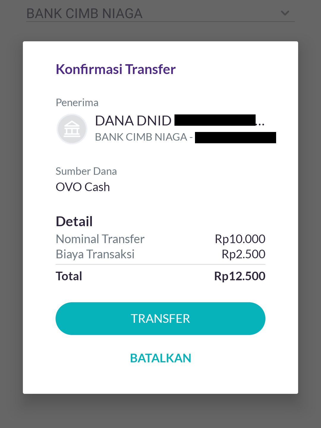 5. Selanjutnya akan muncul Konfirmasi Transfer, pada kolom penerima tertulis “DANA DNID….” Yang artinya itu merupakan rekening DANA kamu. Cek kembali nomor dan nominal transaksi. Jika sudah benar semua klik Transfer.
