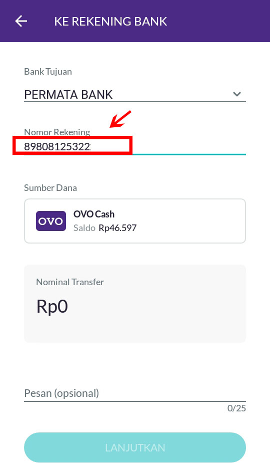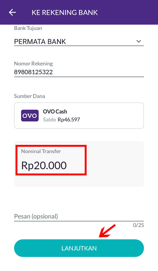 6. Masukkan nilai nominal transfer (min Rp 10.000,-) lalu klik lanjutkan.