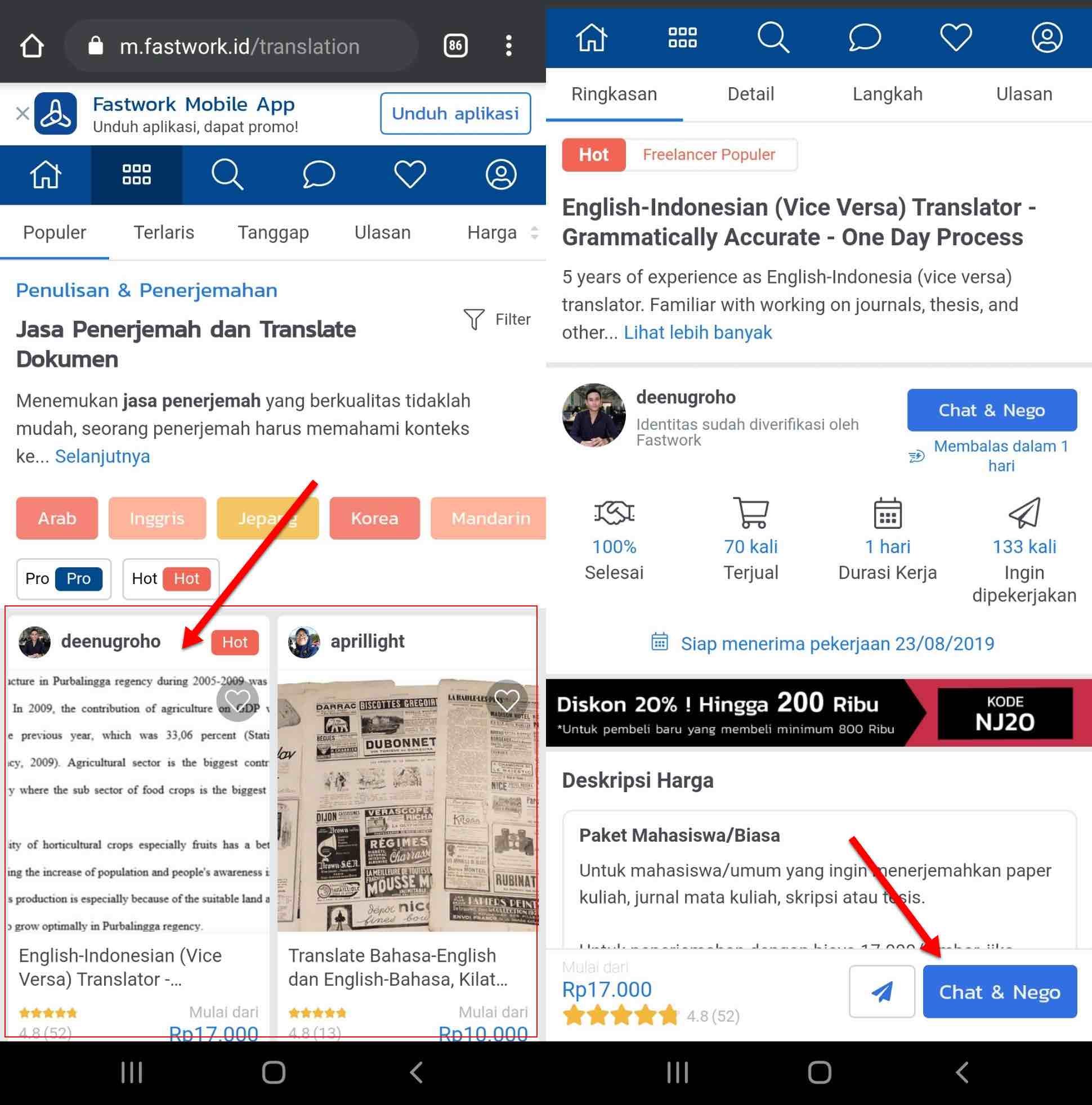 Nah selain itu kamu juga dapat bergabung menjadi translator freelance di https://fastwork.id/translation apabila menguasai bahasa asing untuk mendapatkan penghasilan tambahan. Selain translator ada banyak kategori lainnya seperti desainer, web & pemrograman, fotografer, video editor, konsultasi dan lain sebagainya.