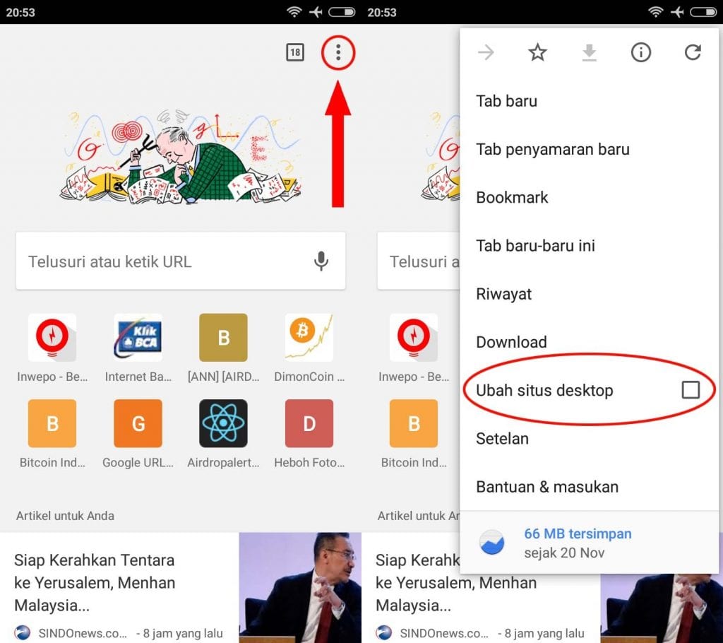 2. Tap pada menu 3 titik hitam di sudut sebelah kanan atas, kemudian tap centang pada Ubah situs desktop.