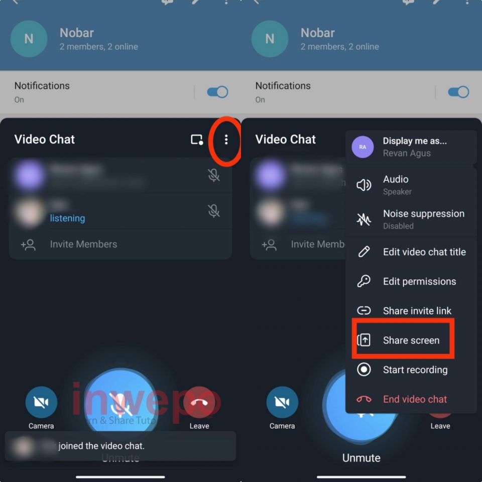 3. Tunggu panggilan tersambung jika sudah tap lagi 3 titik yang ada di pojok kanan, kemudian pilih share screen.