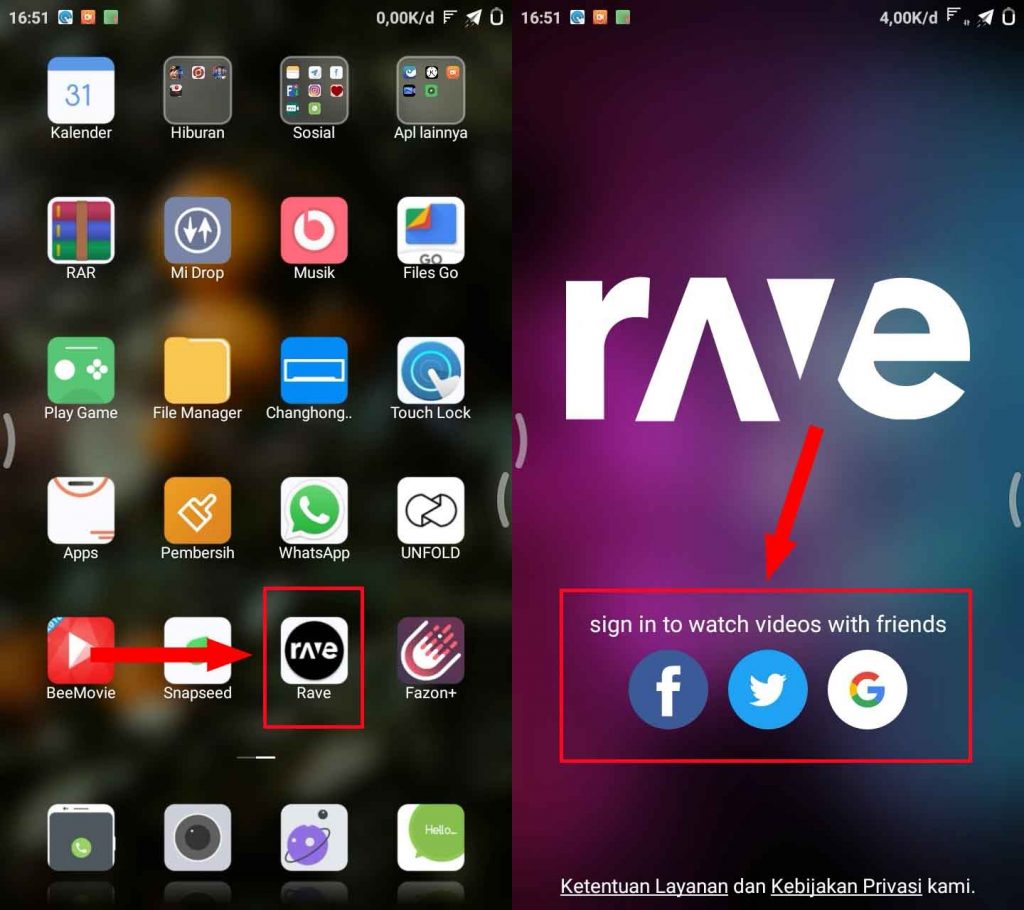2. Selanjutnya kamu bisa membuka aplikasi Rave yang sudah terinstall di smartphone kamu. Kemudian silahkan masuk menggunakan akun media sosial kamu bisa Facebook, Twitter, ataupun akun Google.