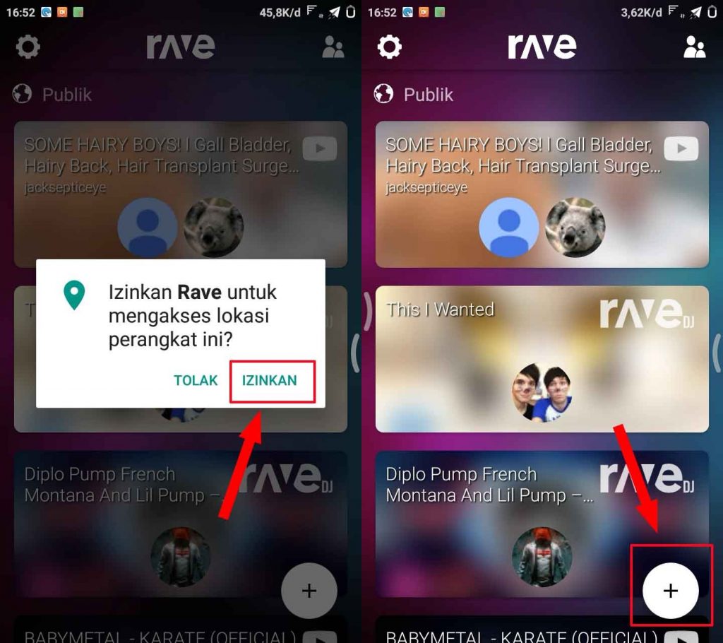 3. Saat menggunakan Rave pertama kali akan ada pop up untuk mengizinkan akses lokasi, tap saja IZINKAN lalu untuk memulai streaming tap ikon plus yang ada di pojok kanan bawah.