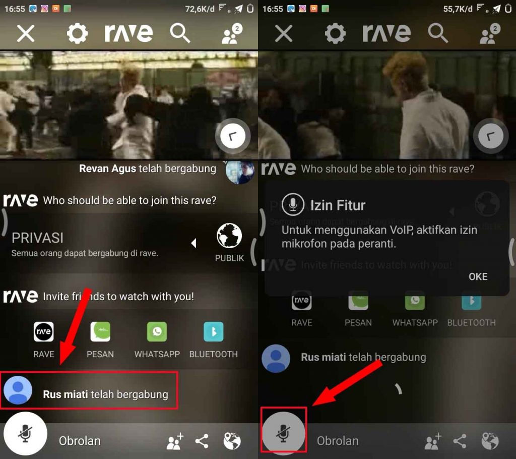 7. Setelah berhasil mengirim undangan tunggu beberapa saat hingga undangan kamu diterima nanti akan muncul nama teman kamu di layar. Untuk bisa berbicara langsung atau mengobrol tap pada ikon mikrofon lalu tap OKE pada notifikasi izin akses yang keluar.