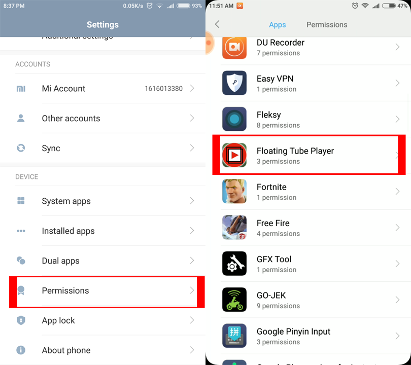 2. Buka Settings (Pengaturan) – Tap Permissions (Perizinan) – Cari dan tap aplikasi Floating Tube.