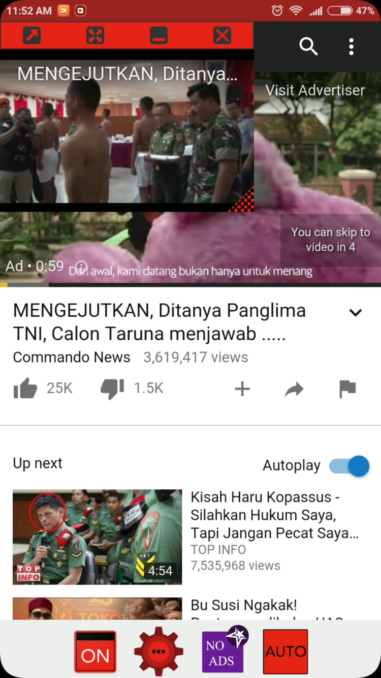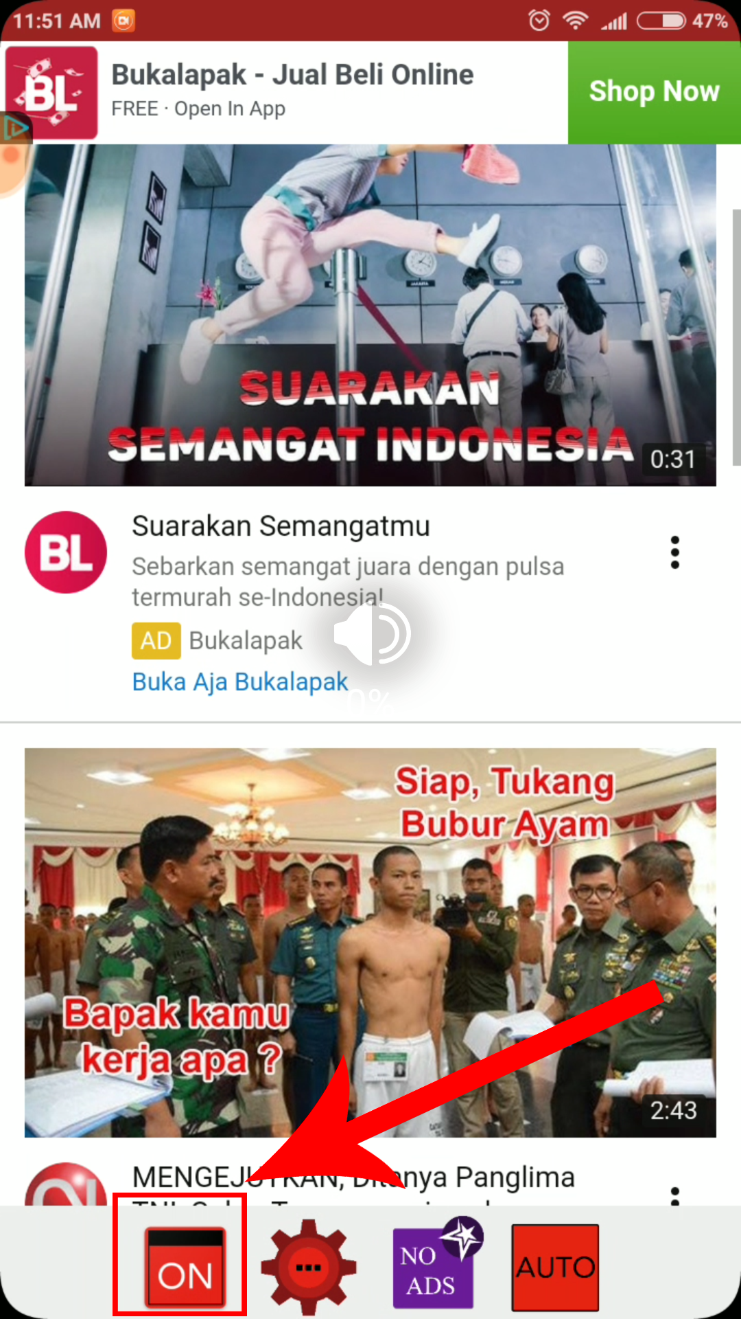 6. Jika sudah, buka aplikasi Floating Tube. Pastikan tombol di bawah di posisi ON agar bisa muncul videonya.