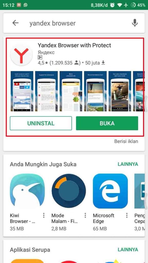 1. Pastikan untuk mendownload dan install terlebih dahulu Yandex Browser di Play Store.