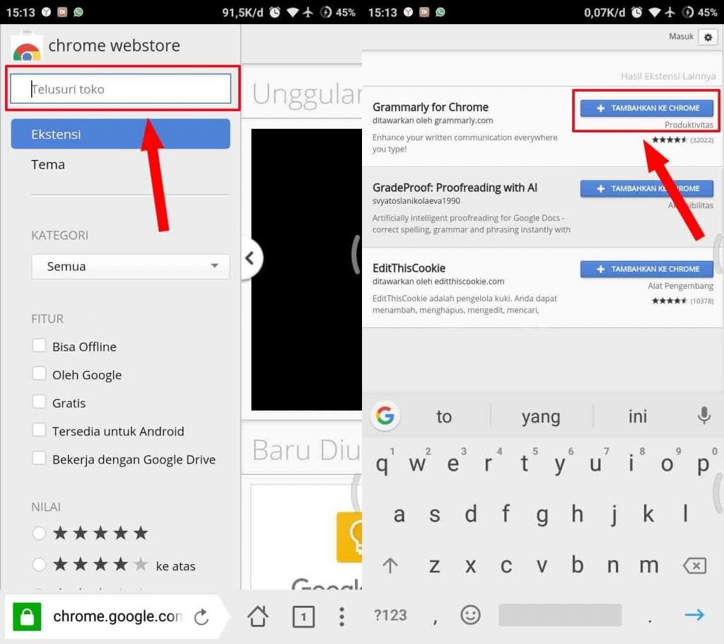 4. Cari ekstensi yang ingin kamu pasang melalui kolom pencarian. Jika sudah Tap tombol biru atau TAMBAHKAN KE CHROME.
