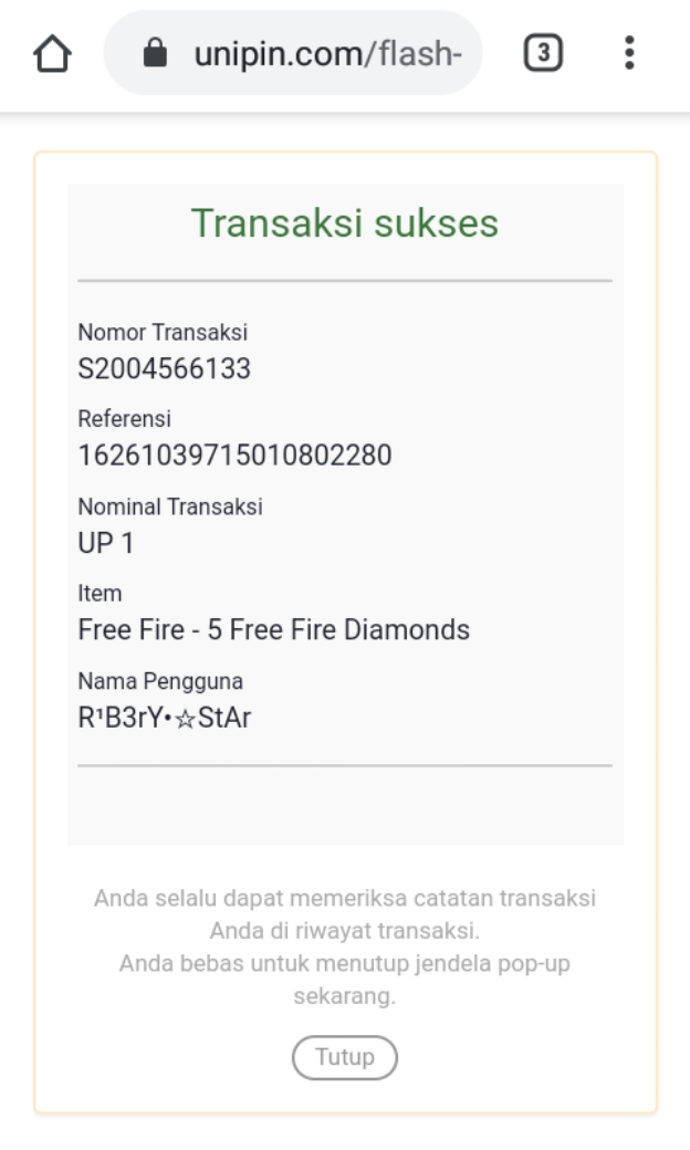 9. Dan kamu sudah berhasil melakukan Top Up Diamond Free Fire di UniPin.